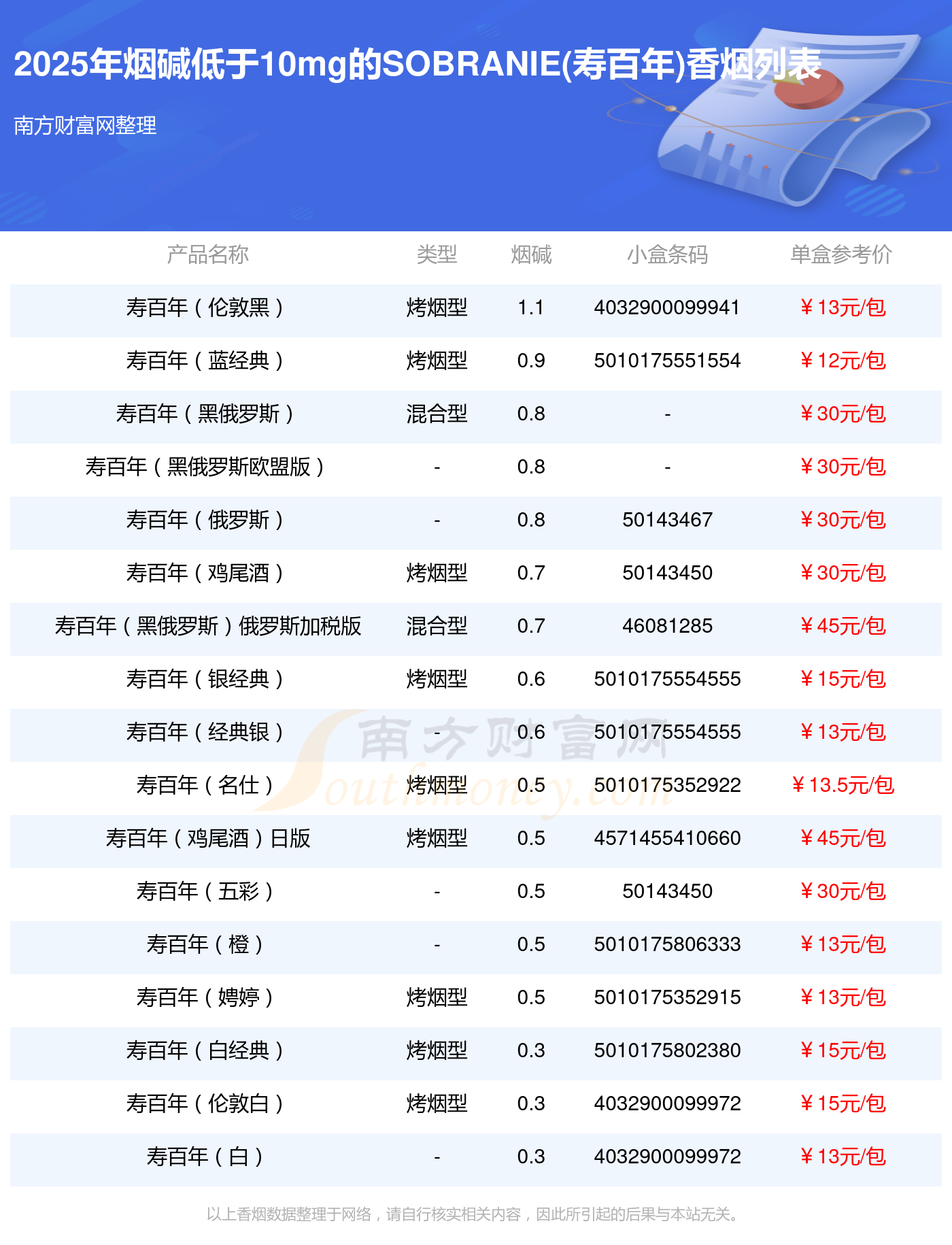 擇煙網(wǎng)為大家盤點了SOBRANIE(壽百年)香煙煙堿低于10mg的,分別有壽百年(倫敦黑)、壽百年(藍經(jīng)典)、壽百年(黑俄羅斯)、壽百年(黑俄羅斯歐盟版)、壽百年(俄羅斯)、壽百年(雞尾酒)、壽百年(黑俄羅斯)俄羅斯加稅版、壽百年(銀經(jīng)典)、壽百年(經(jīng)典銀)、壽百年(名仕)等,具體價格如下: