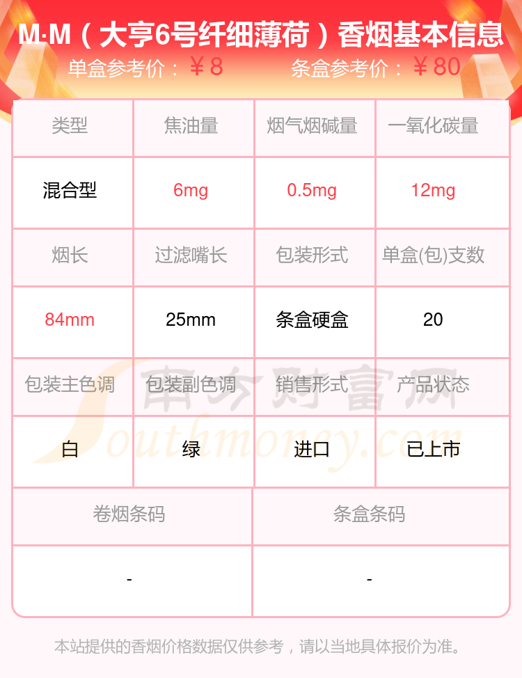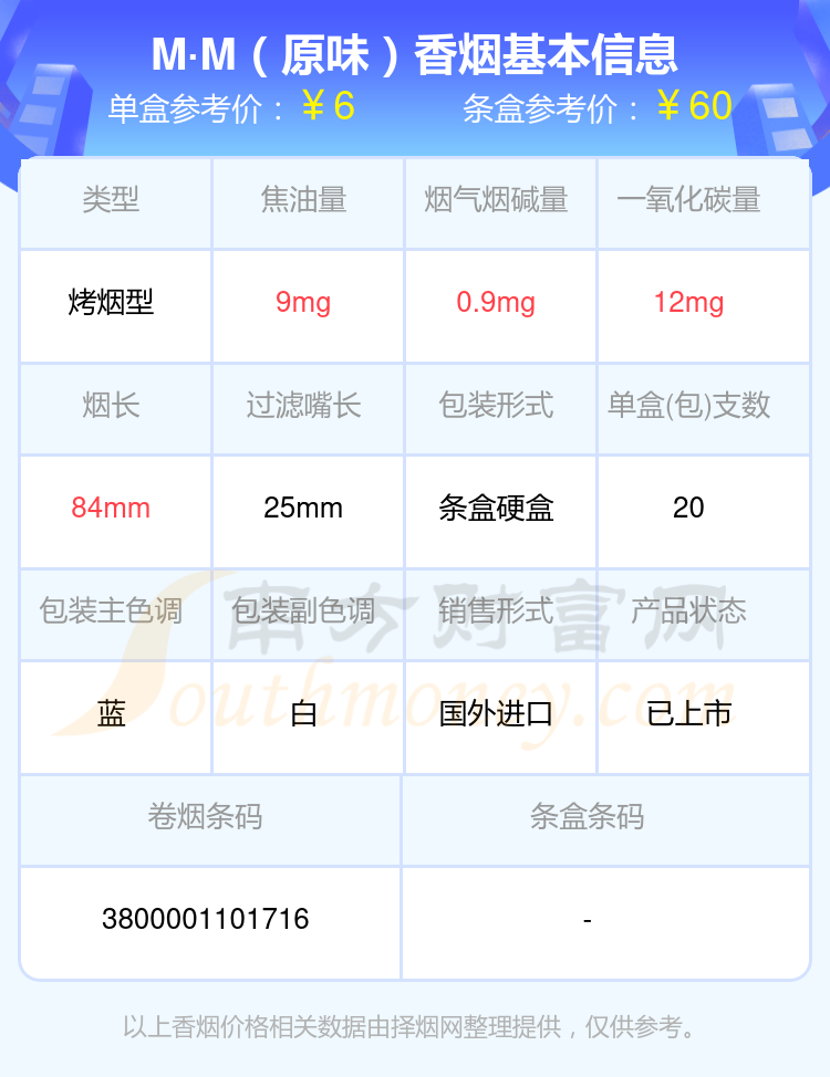 M·M香煙尼古丁量低于1mg的煙有M·M(原味)、M·M(大亨6號(hào)纖細(xì)薄荷)等,詳細(xì)價(jià)格如下:
