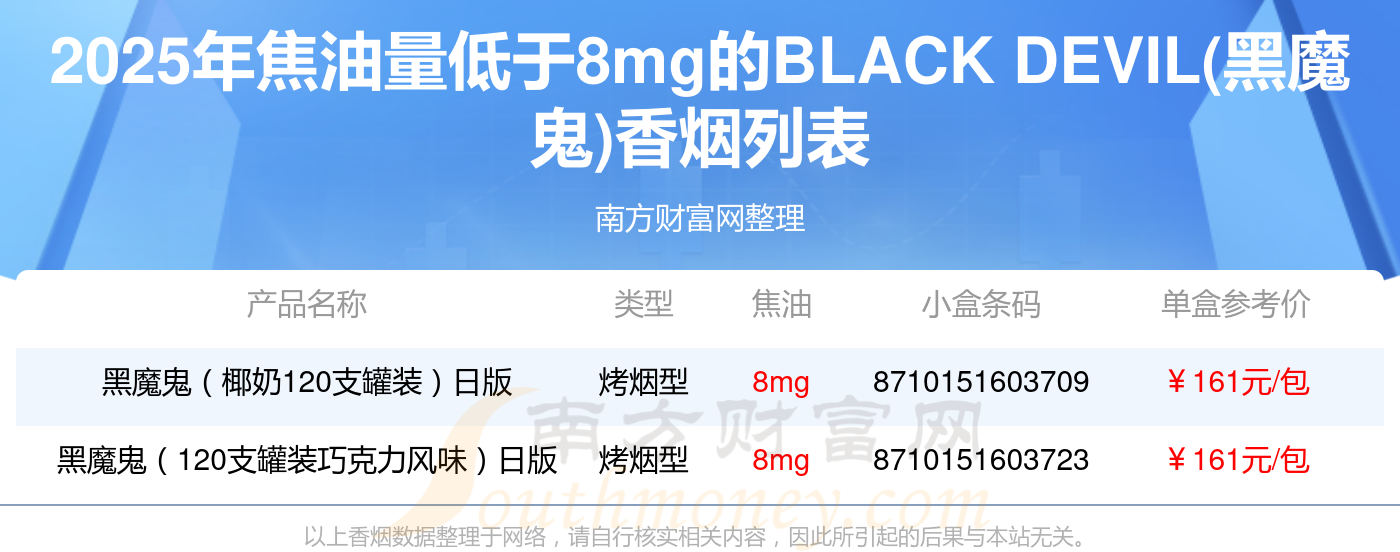 BLACK DEVIL(黑魔鬼)香煙焦油量低于8mg的煙分別有黑魔鬼(椰奶120支罐裝)日版參考價(jià)161.0元/包、黑魔鬼(120支罐裝巧克力風(fēng)味)日版參考價(jià)161.0元/包等。