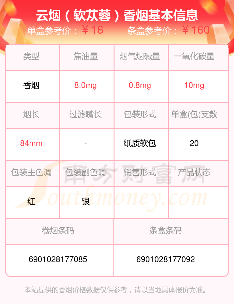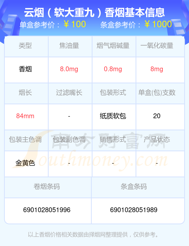 云煙(軟蓯蓉)參考價16.0元/包、云煙(win)參考價22.0元/包、云煙(細(xì)支珍品)參考價26.0元/包、云煙(神秘花園)參考價32.0元/包、云煙(軟大重九)參考價100.0元/包、云煙(清甜香)參考價35.0元/包、云煙(金福8mg)參考價16.0元/包、云煙(軟印象)參考價85.0元/包、云煙(細(xì)支大重九)參考價100.0元/包、云煙(印象煙莊中支)出口版參考價35.0元/包等。