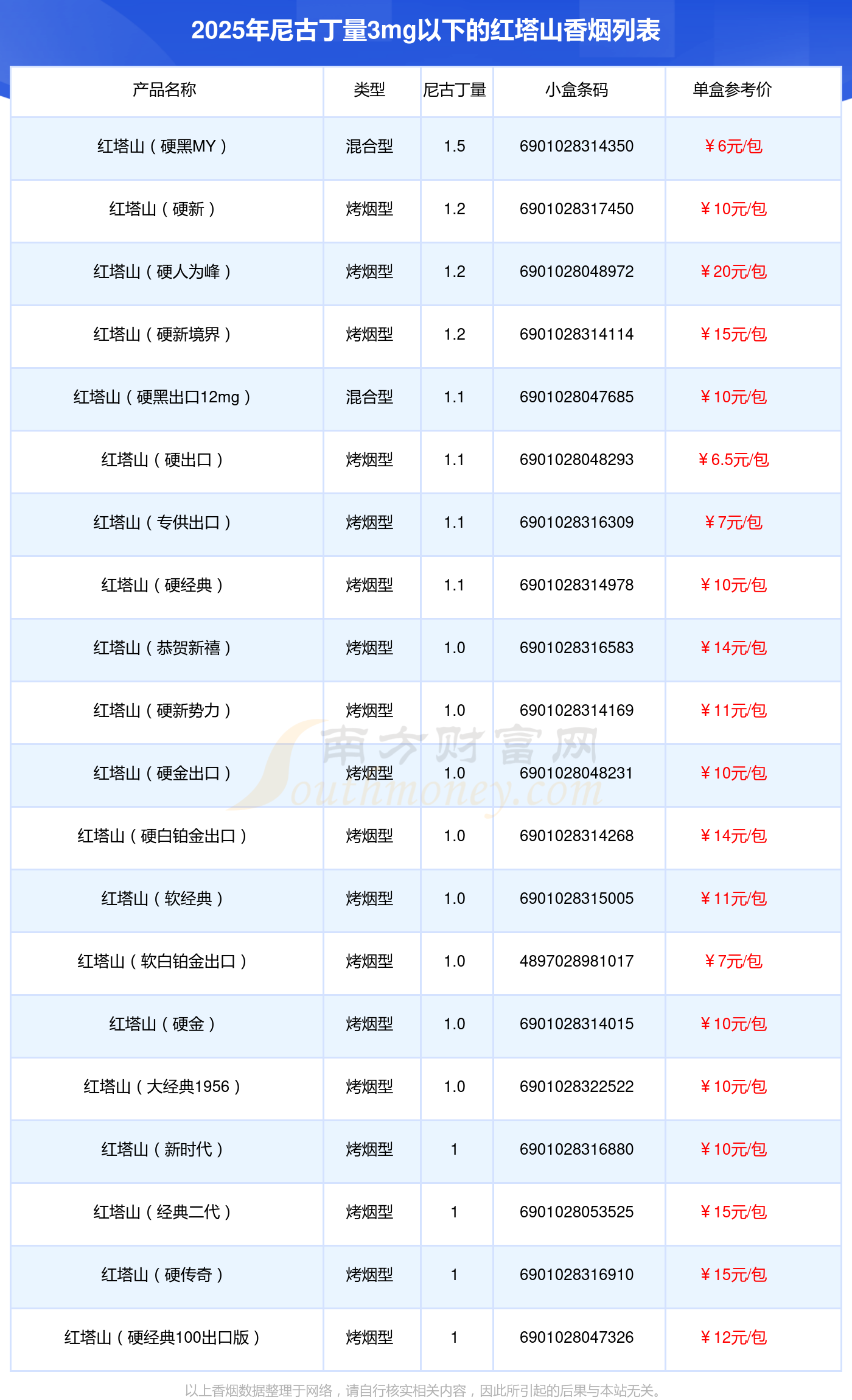 擇煙網(wǎng)為大家盤點了紅塔山香煙尼古丁量3mg以下的,分別有紅塔山(硬黑MY)、紅塔山(硬新)、紅塔山(硬人為峰)、紅塔山(硬新境界)、紅塔山(硬黑出口12mg)、紅塔山(硬出口)、紅塔山(專供出口)、紅塔山(硬經(jīng)典)、紅塔山(恭賀新禧)、紅塔山(硬新勢力)等,具體價格如下: