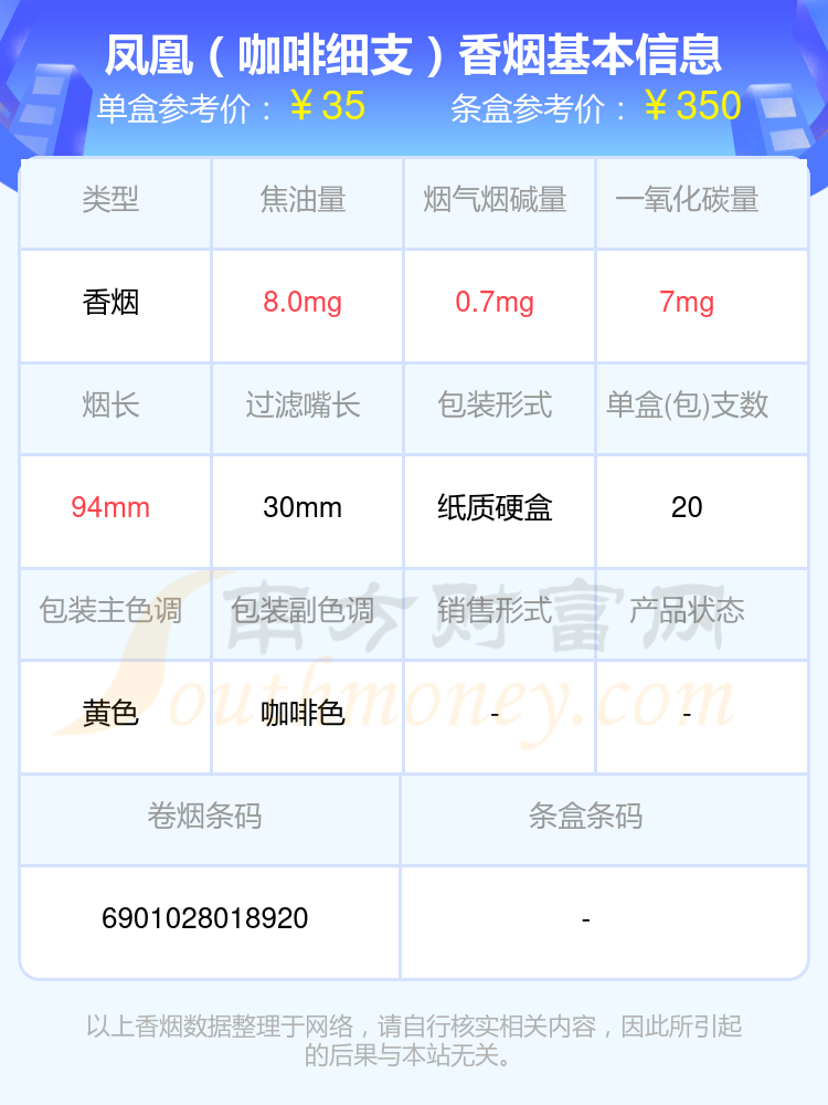鳳凰(咖啡細(xì)支)參考價(jià)35.0元/包、鳳凰(細(xì)支)參考價(jià)35.0元/包等。