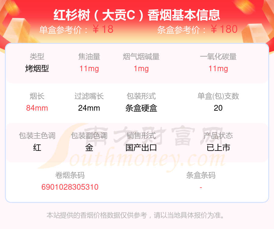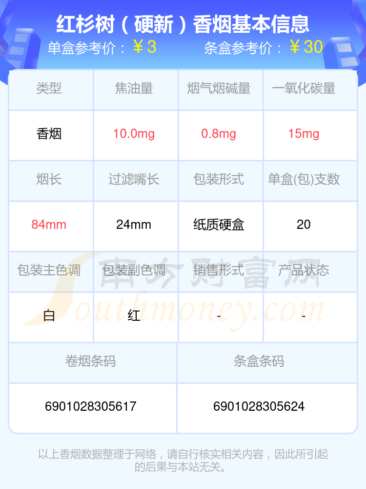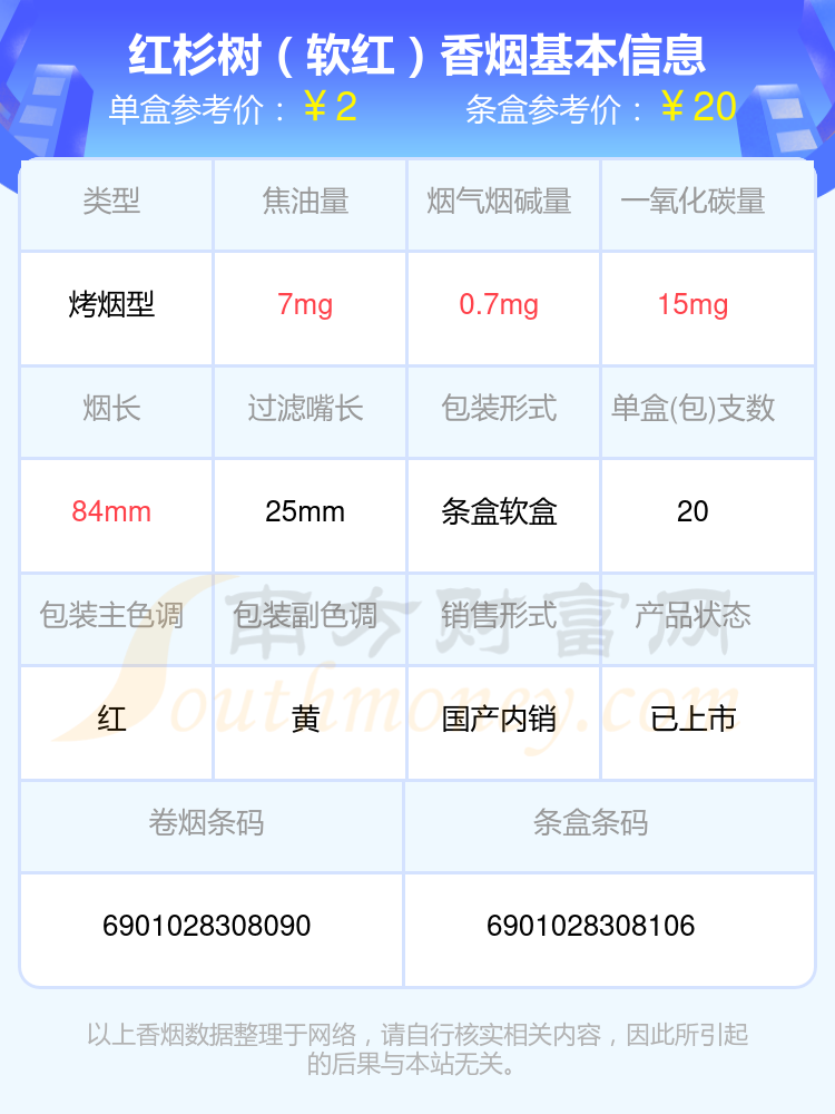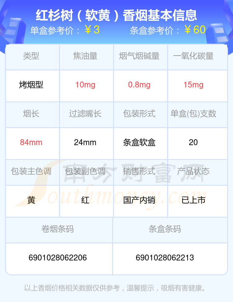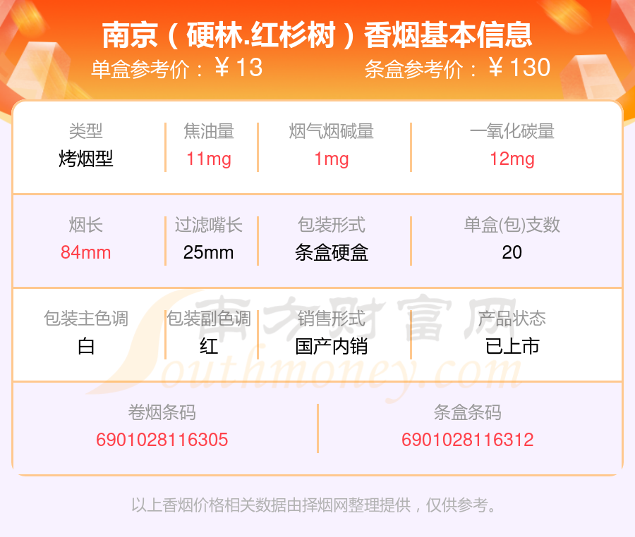 煙堿1mg以下的紅杉樹(shù)香煙有哪些?擇煙網(wǎng)為大家整理盤(pán)點(diǎn),有紅杉樹(shù)(大貢C)、南京(硬林.紅杉樹(shù))、紅杉樹(shù)(新醇)、紅杉樹(shù)(硬新)、紅杉樹(shù)(軟黃)、紅杉樹(shù)(軟紅)等,詳細(xì)價(jià)格如下: