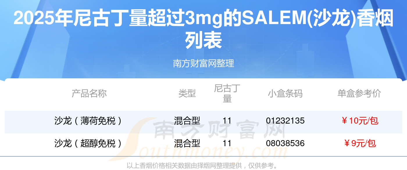 SALEM(沙龍)香煙尼古丁量超過(guò)3mg的煙有哪些?擇煙網(wǎng)為大家整理提供,分別有:沙龍(薄荷免稅)、沙龍(超醇免稅)等,具體價(jià)格如下: