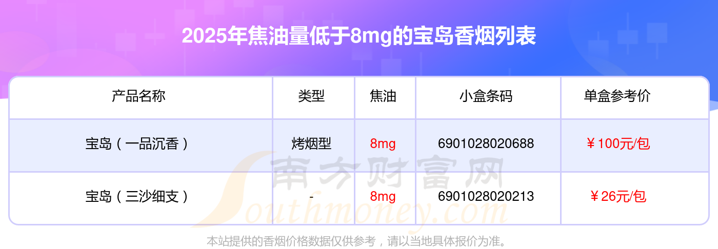 擇煙網為大家盤點了焦油量低于8mg的寶島香煙,有以下這些:
