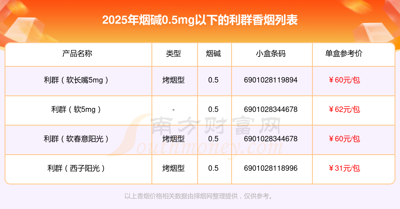 擇煙網(wǎng)為大家盤點(diǎn)了利群香煙煙堿0.5mg以下的煙,有以下這些: