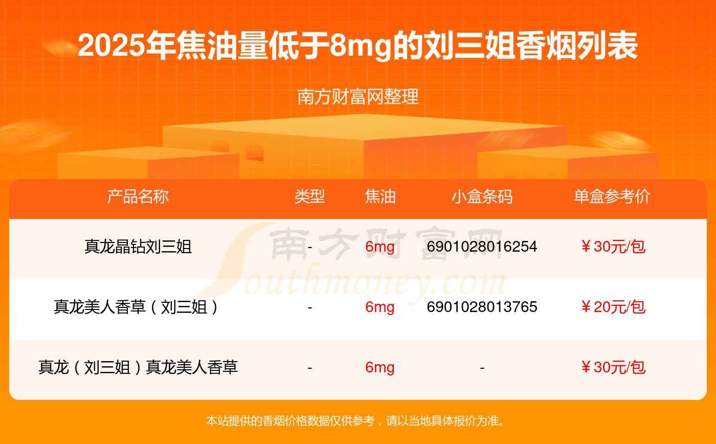焦油量低于8mg的劉三姐香煙有哪些?擇煙網(wǎng)為大家整理盤(pán)點(diǎn),有真龍晶鉆劉三姐、真龍美人香草(劉三姐)、真龍(劉三姐)真龍美人香草等,詳細(xì)價(jià)格如下:
