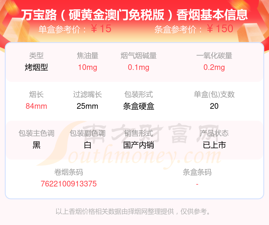 擇煙網(wǎng)為大家盤點了金澳門香煙尼古丁低于2mg的,分別有金澳門、555(金澳門加稅)、萬寶路(硬黃金澳門免稅版)等,具體價格如下: