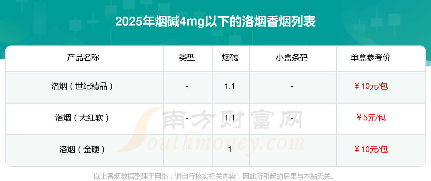 擇煙網(wǎng)為大家盤點(diǎn)了洛煙香煙煙堿4mg以下的,分別有洛煙(世紀(jì)精品)、洛煙(大紅軟)、洛煙(金硬)等,詳細(xì)價(jià)格如下: