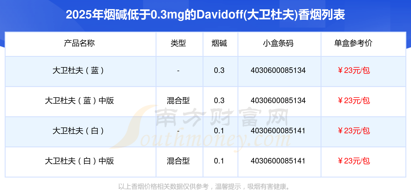 Davidoff(大衛(wèi)杜夫)香煙煙堿低于0.3mg的煙分別有大衛(wèi)杜夫(藍)參考價23元/包、大衛(wèi)杜夫(藍)中版參考價23.0元/包、大衛(wèi)杜夫(白)參考價23元/包、大衛(wèi)杜夫(白)中版參考價23.0元/包等。
