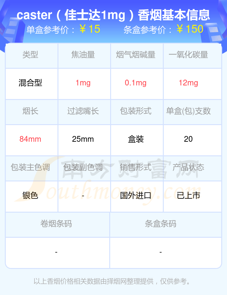 CASTER(佳士達(dá))香煙煙堿量低于0.5mg的煙有佳士達(dá)(紅)、佳士達(dá)(紅中免)、佳士達(dá)(硬紅)、佳士達(dá)(黃)、caster(佳士達(dá)1mg)等,詳細(xì)價(jià)格如下:
