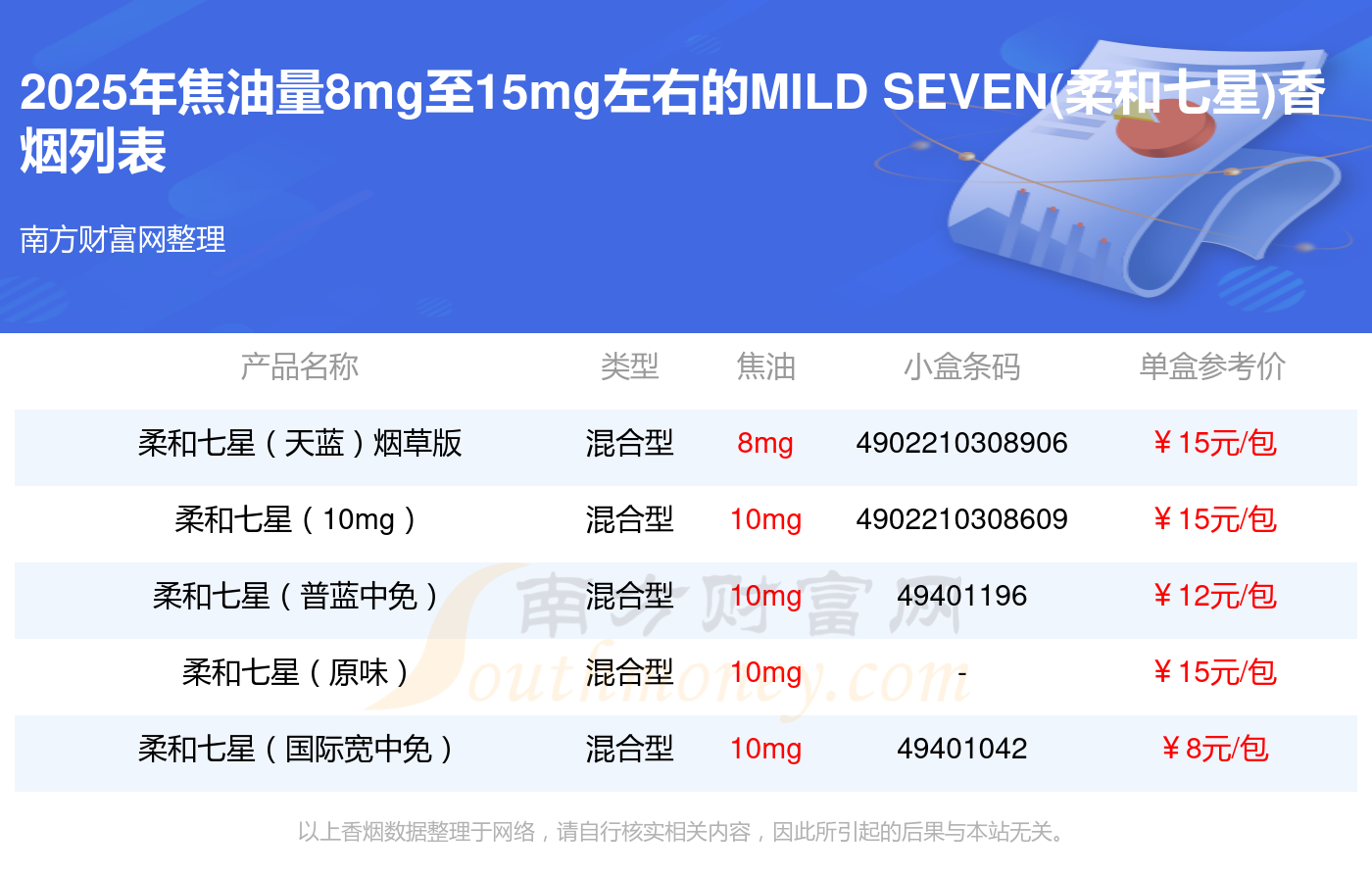 MILD SEVEN(柔和七星)香煙焦油量8mg至15mg左右的有哪些?擇煙網(wǎng)為大家整理提供,分別有:
