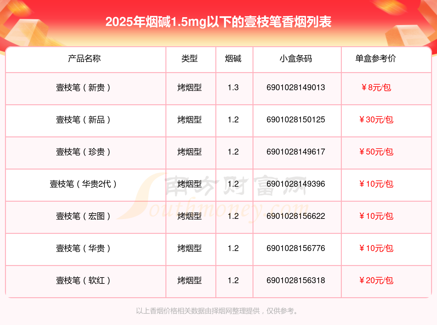 擇煙網(wǎng)為大家盤點(diǎn)了煙堿1.5mg以下的壹枝筆香煙,有壹枝筆(新貴)、壹枝筆(新品)、壹枝筆(珍貴)、壹枝筆(華貴2代)、壹枝筆(宏圖)、壹枝筆(華貴)、壹枝筆(軟紅)等,詳細(xì)價(jià)格如下: