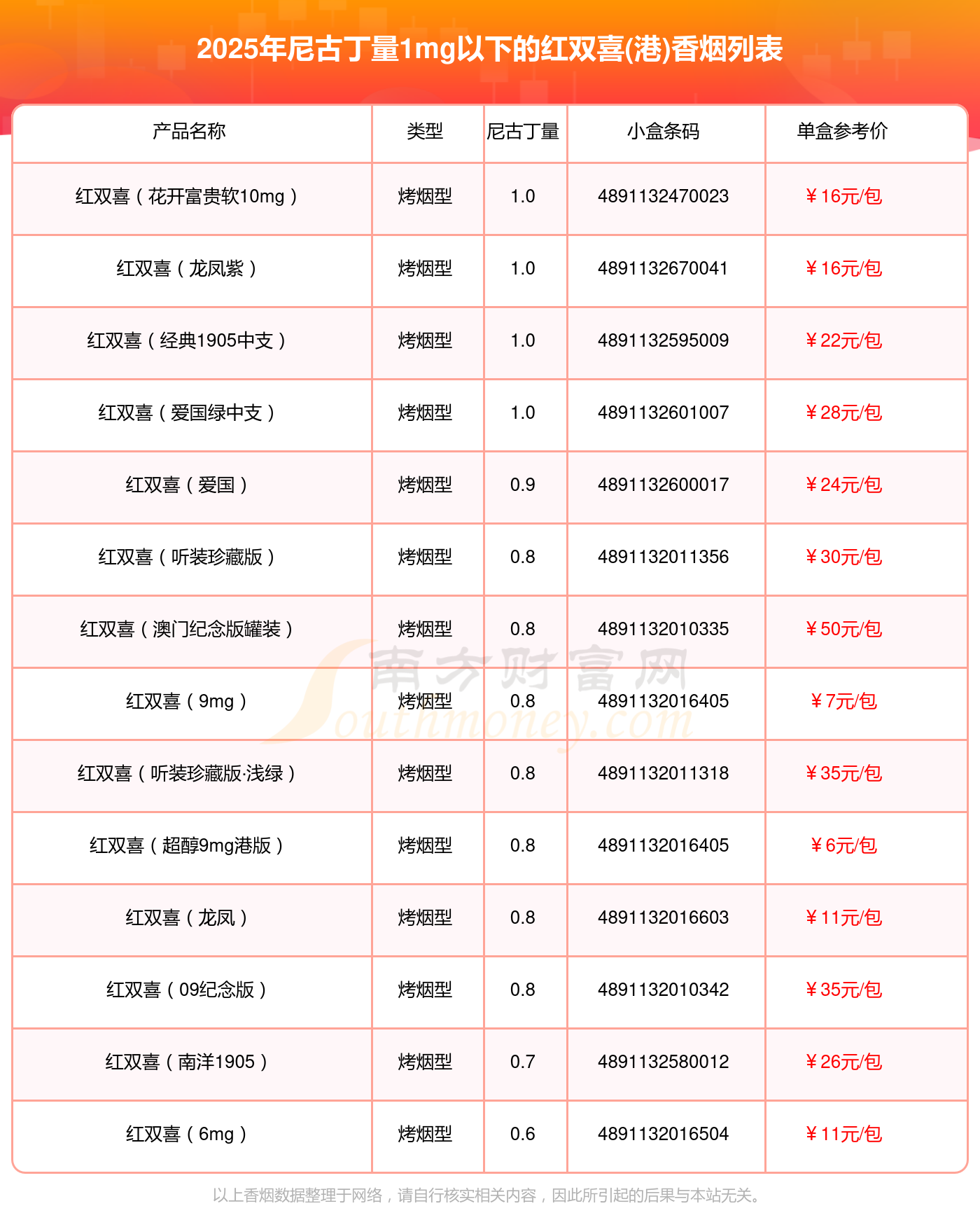 紅雙喜(港)香煙尼古丁量1mg以下的煙有哪些?擇煙網(wǎng)為大家整理提供,分別有:紅雙喜(花開富貴軟10mg)、紅雙喜(龍鳳紫)、紅雙喜(經(jīng)典1905中支)、紅雙喜(愛國綠中支)、紅雙喜(愛國)、紅雙喜(聽裝珍藏版)、紅雙喜(澳門紀(jì)念版罐裝)、紅雙喜(9mg)、紅雙喜(聽裝珍藏版·淺綠)、紅雙喜(超醇9mg港版)等,具體價格如下: