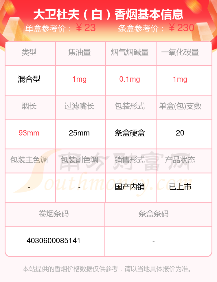 大衛(wèi)杜夫(藍(lán))參考價(jià)23元/包、大衛(wèi)杜夫(藍(lán))中版參考價(jià)23.0元/包、大衛(wèi)杜夫(白)參考價(jià)23元/包、大衛(wèi)杜夫(白)中版參考價(jià)23.0元/包等。