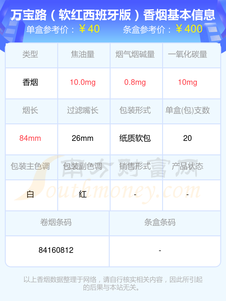 Marlboro(萬寶路)香煙40-70元的煙有Marlboro(double burst)澳門有稅版、萬寶路(軟紅西班牙版)等,具體價(jià)格如下: