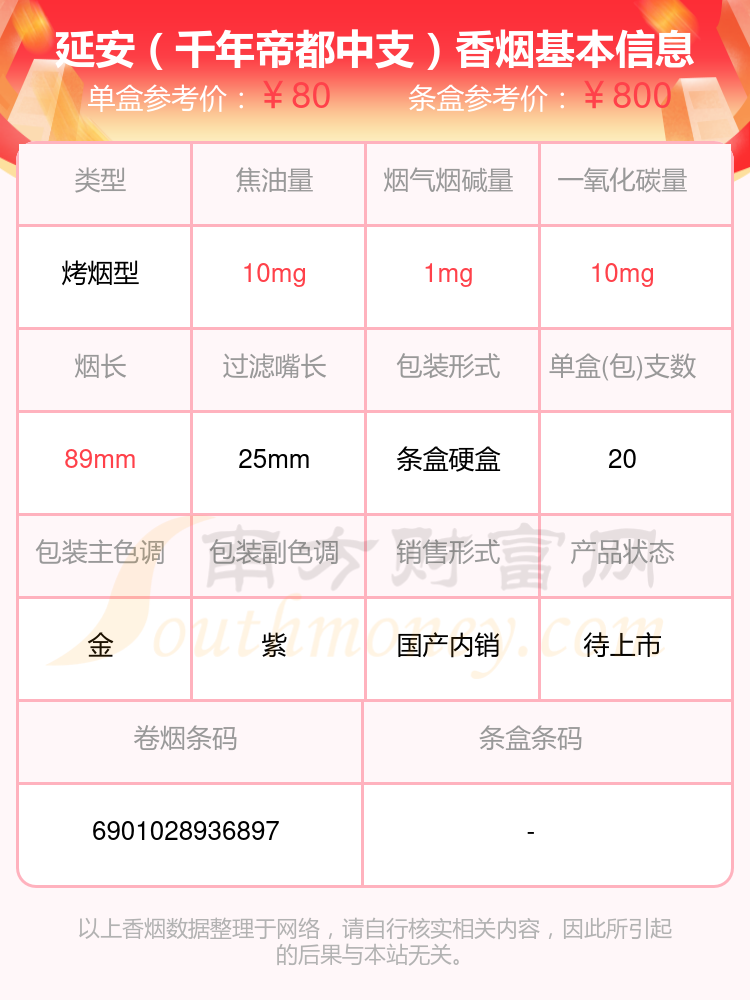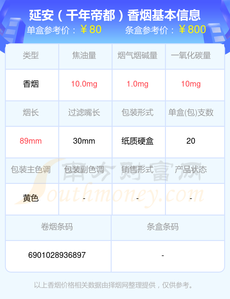延安香煙70元至80元左右的煙有哪些?擇煙網(wǎng)為大家整理提供,分別有:延安(千年帝都)、延安(千年帝都中支)等,具體價格如下: