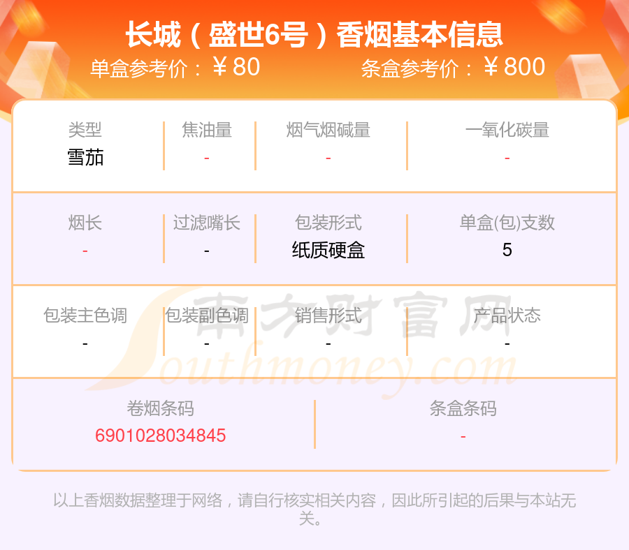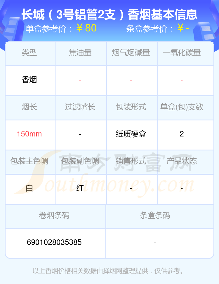 長(zhǎng)城香煙70元到80元的煙有長(zhǎng)城(3號(hào)鋁管2支)、長(zhǎng)城(盛世6號(hào))等,具體價(jià)格如下:
