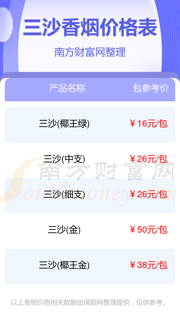 三沙香煙價(jià)格最高的是三沙(金),參考價(jià)50.0元/包,最低的是三沙(椰王綠),參考價(jià)16.0元/包,價(jià)格高低差為34元/包。
