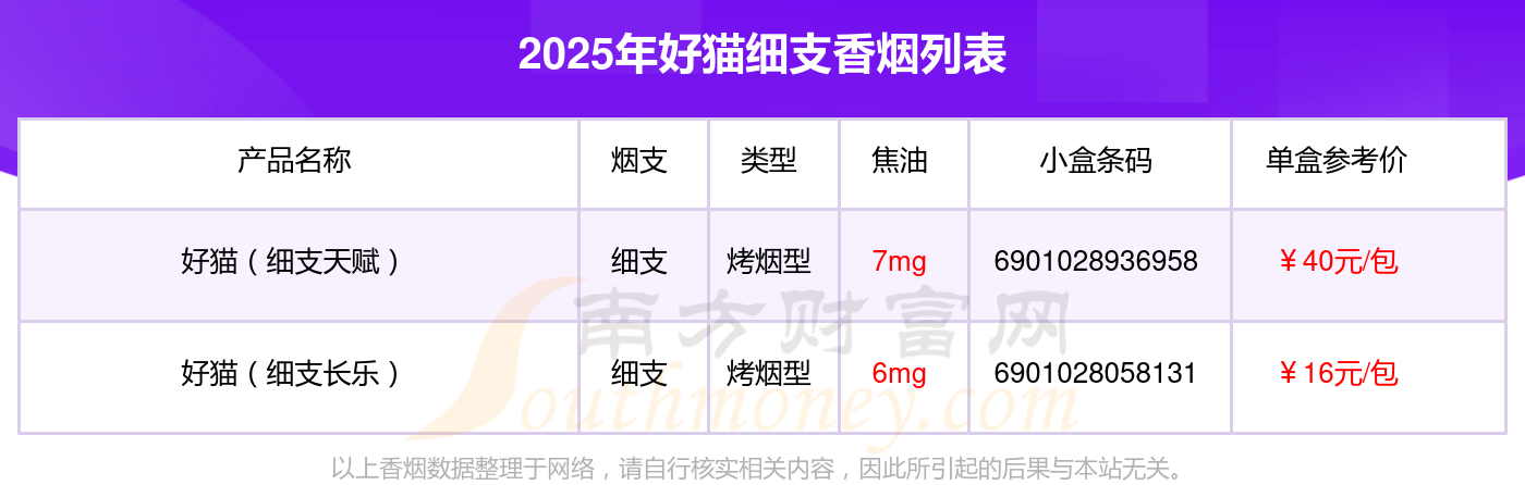 好貓(細支天賦)參考價40.0元/包、好貓(細支長樂)參考價16.0元/包等。