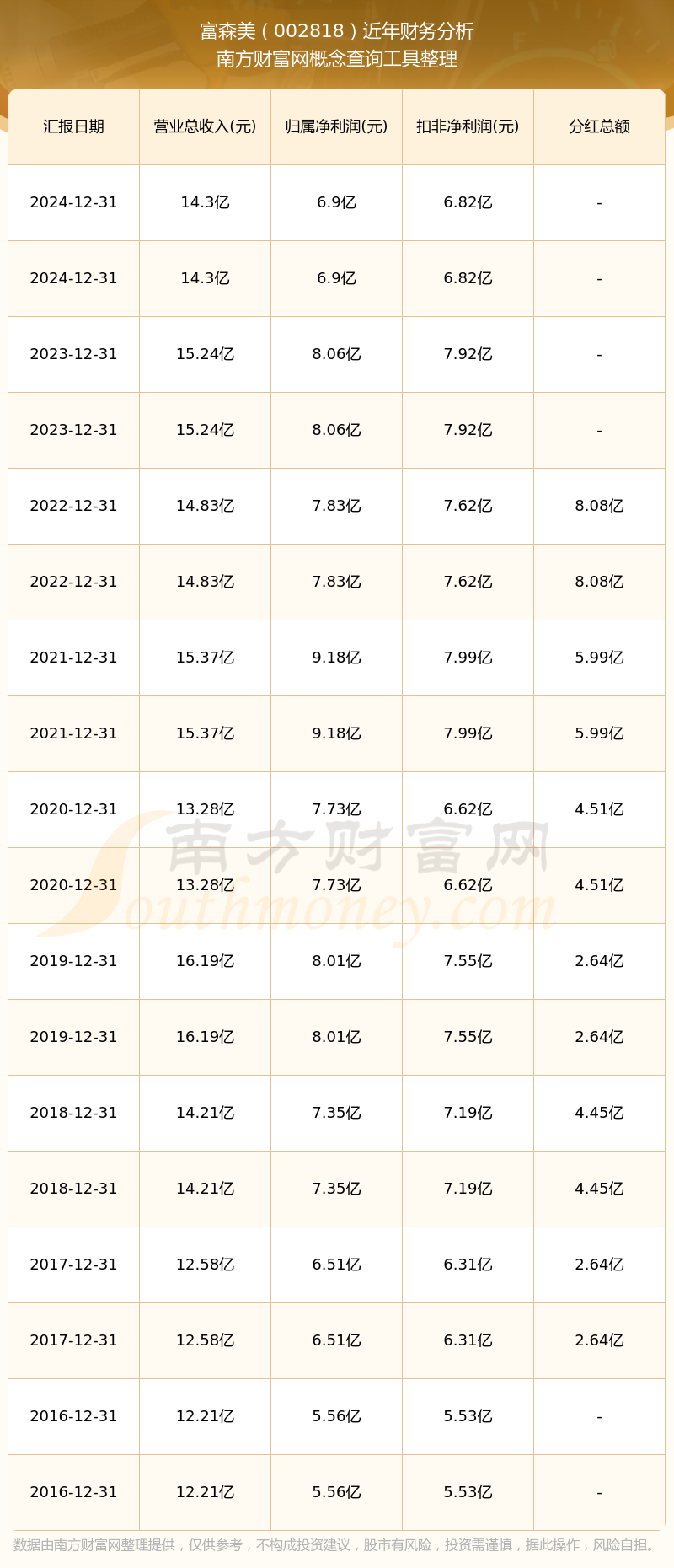 富森美公司2024年實(shí)現(xiàn)營業(yè)收入14.3億元,同比增長-6.18%;凈利潤6.9億元,同比增長-14.39%;毛利率67.24%。