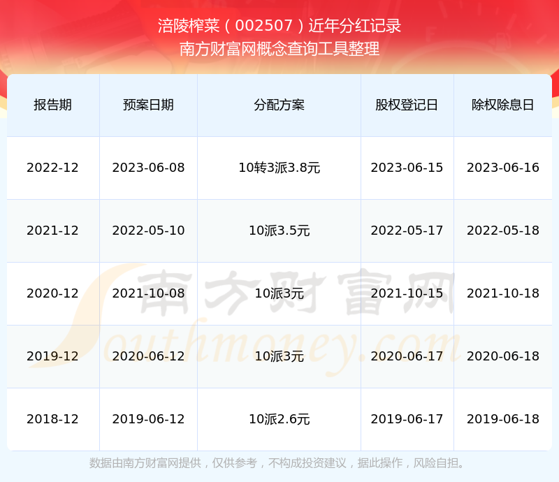 涪陵榨菜002507分紅時(shí)間: