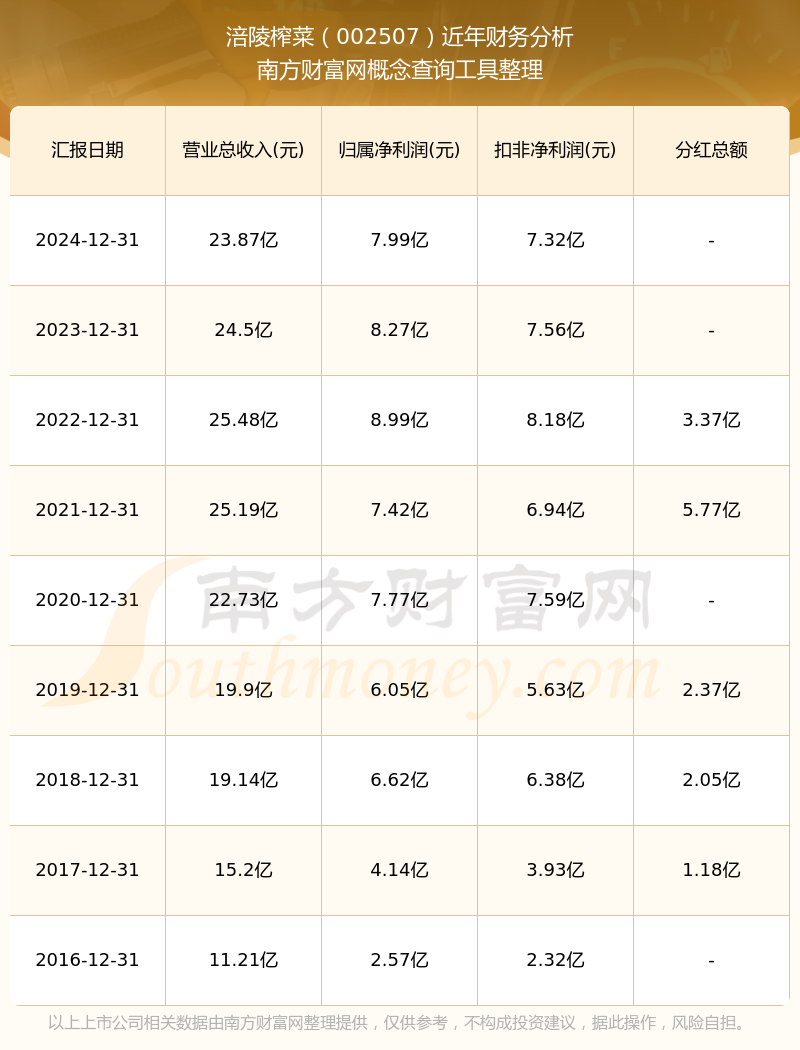 涪陵榨菜公司2024年實(shí)現(xiàn)營業(yè)收入23.87億元,同比增長-2.56%;凈利潤7.99億元,同比增長-3.29%;毛利率50.99%。