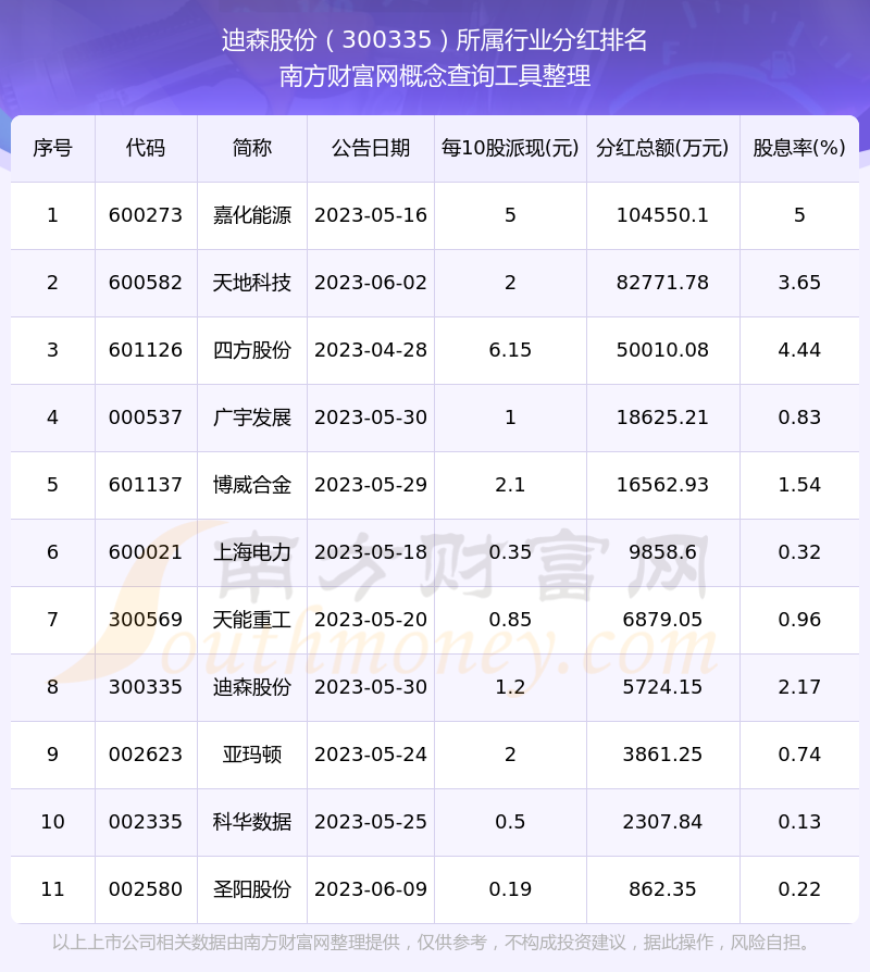 按照南方財富網(wǎng)趨勢選股系統(tǒng)統(tǒng)計,迪森股份所屬行業(yè)為新能源行業(yè),新能源行業(yè)分紅排名情況如下表: