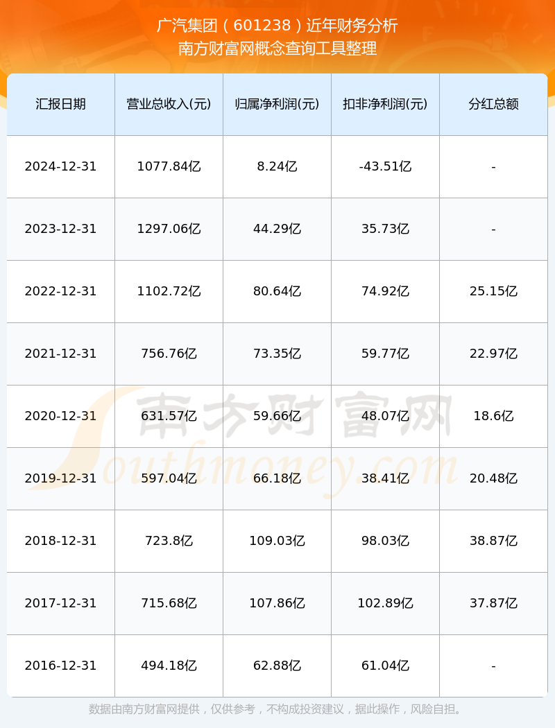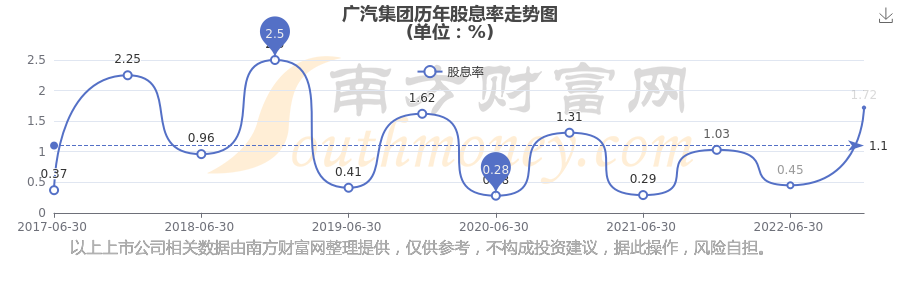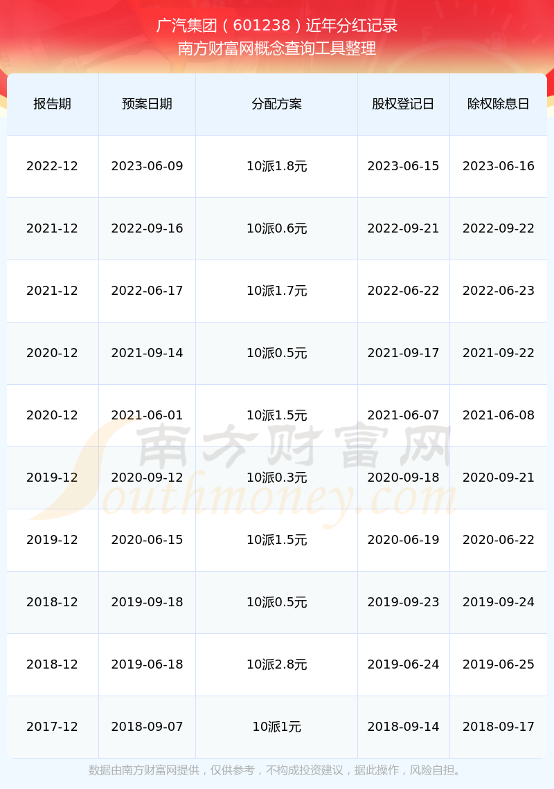 廣汽集團最新一次公布的分紅方案為10派1.8元。本次權(quán)益分派股權(quán)登記日為2023年6月15日,除權(quán)除息日為2023年6月16日,派息日為2023年6月16日。