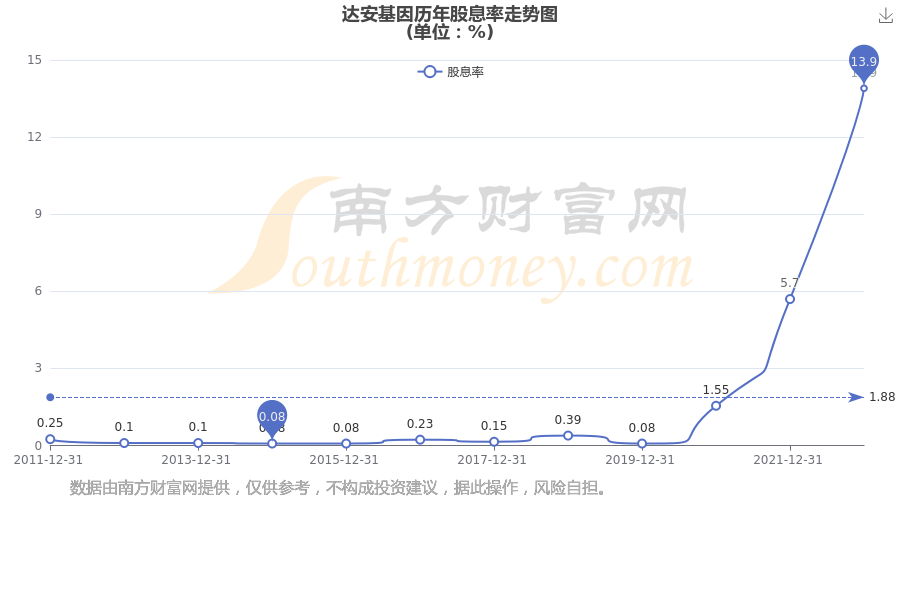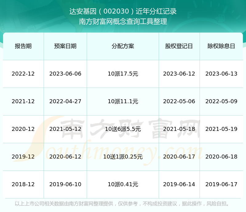達安基因最新一次公布的分紅方案為10派17.5元。本次權益分派股權登記日為2023年6月12日,除權除息日為2023年6月13日,派息日為2023年6月13日。