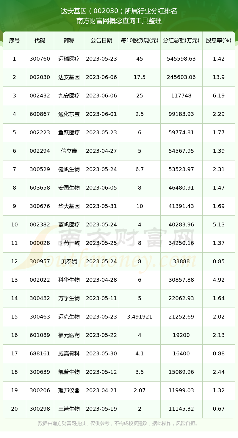 按照南方財富網(wǎng)趨勢選股系統(tǒng)統(tǒng)計,達安基因所屬行業(yè)為醫(yī)療器械行業(yè),醫(yī)療器械行業(yè)分紅排名情況如下表: