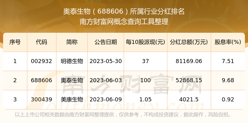按照南方財(cái)富網(wǎng)趨勢(shì)選股系統(tǒng)統(tǒng)計(jì),奧泰生物所屬行業(yè)為體外診斷試劑行業(yè),體外診斷試劑行業(yè)分紅排名情況如下表: