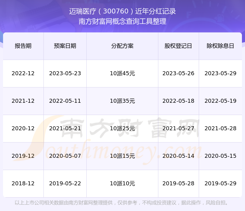 邁瑞醫(yī)療最新一次公布的分紅方案為10派45元。本次權(quán)益分派股權(quán)登記日為2023年5月26日,除權(quán)除息日為2023年5月29日,派息日為2023年5月29日。