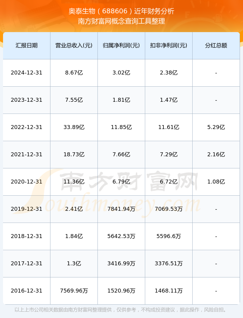 近年奧泰生物分紅派息情況如下表所示: