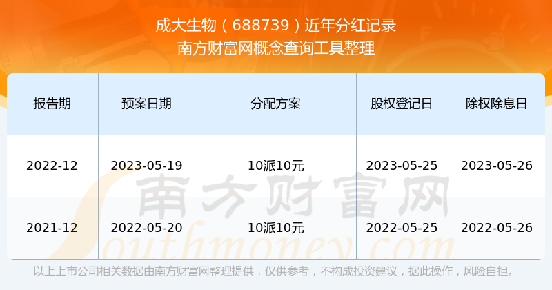 成大生物最新一次公布的分紅方案為10派10元。本次權(quán)益分派股權(quán)登記日為2023年5月25日,除權(quán)除息日為2023年5月26日,派息日為2023年5月26日。