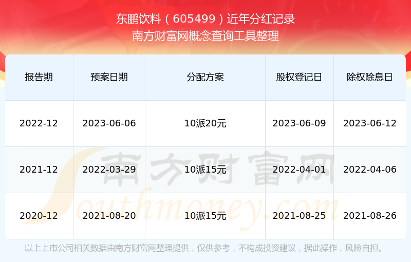 東鵬飲料最新一次公布的分紅方案為10派20元。本次權(quán)益分派股權(quán)登記日為2023年6月9日,除權(quán)除息日為2023年6月12日,派息日為2023年6月12日。