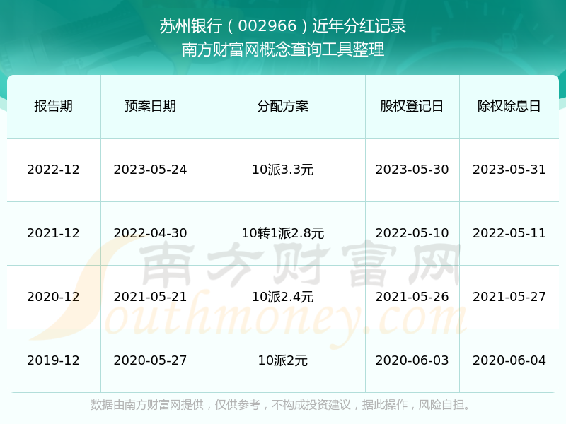 蘇州銀行最新一次公布的分紅方案:10派3.3元。