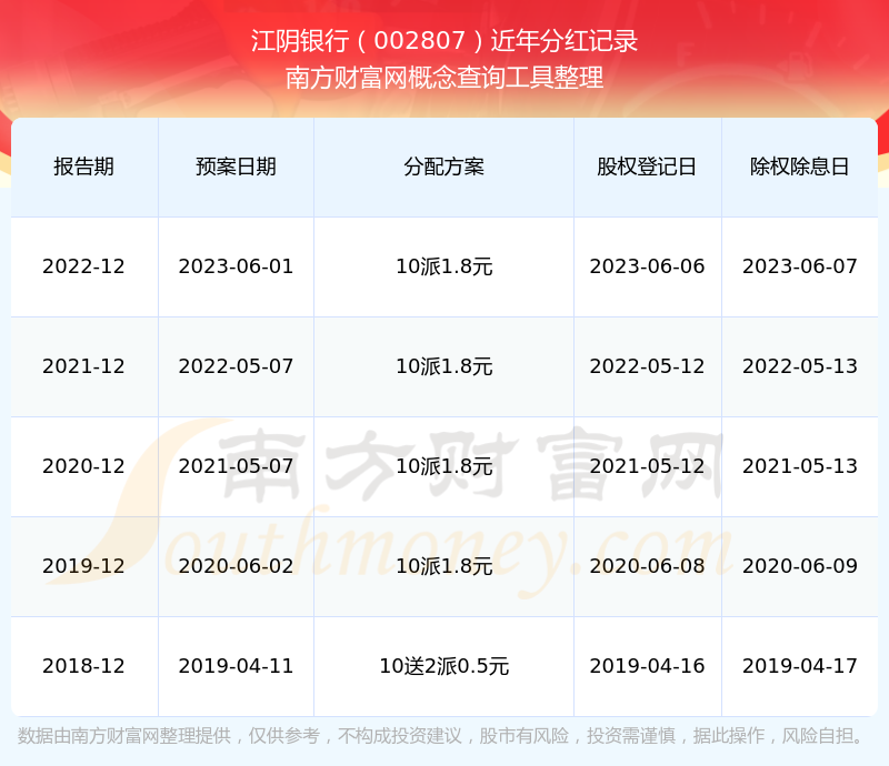 江陰銀行最新一次公布的分紅方案為10派1.8元。本次權(quán)益分派股權(quán)登記日為2023年6月6日,除權(quán)除息日為2023年6月7日,派息日為2023年6月7日。