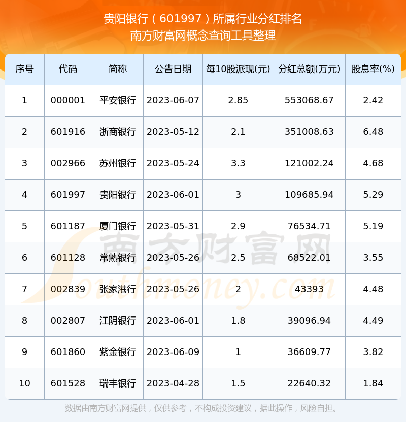 二、貴陽(yáng)銀行601997行業(yè)分紅排名