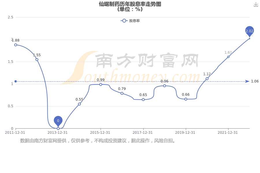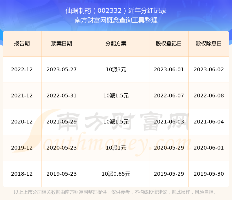仙琚制藥最新一次公布的分紅方案為10派3元。本次權益分派股權登記日為2023年6月1日,除權除息日為2023年6月2日,派息日為2023年6月2日。