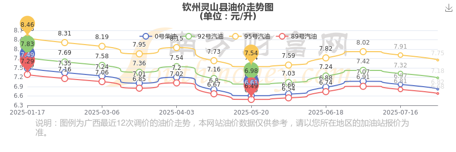 欽州靈山縣汽油、柴油10月12日每升最新價格為:0號柴油為6.82元,減了0.15元;95號汽油為7.75元;92號汽油為7.18元;89號汽油為6.68元,調整時間為8月27日。