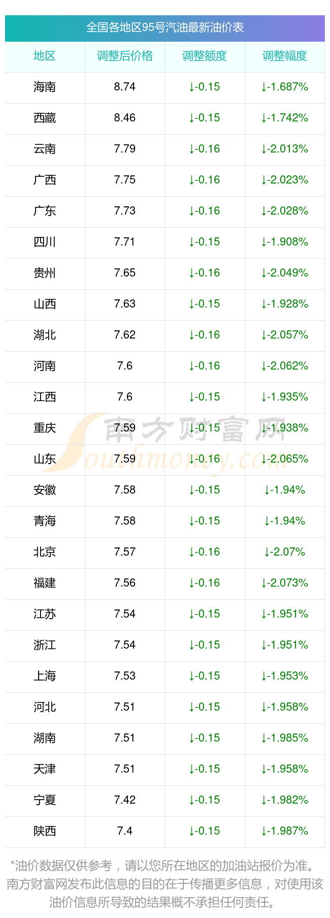 全國各地區(qū)95號(hào)汽油油價(jià)一覽表
