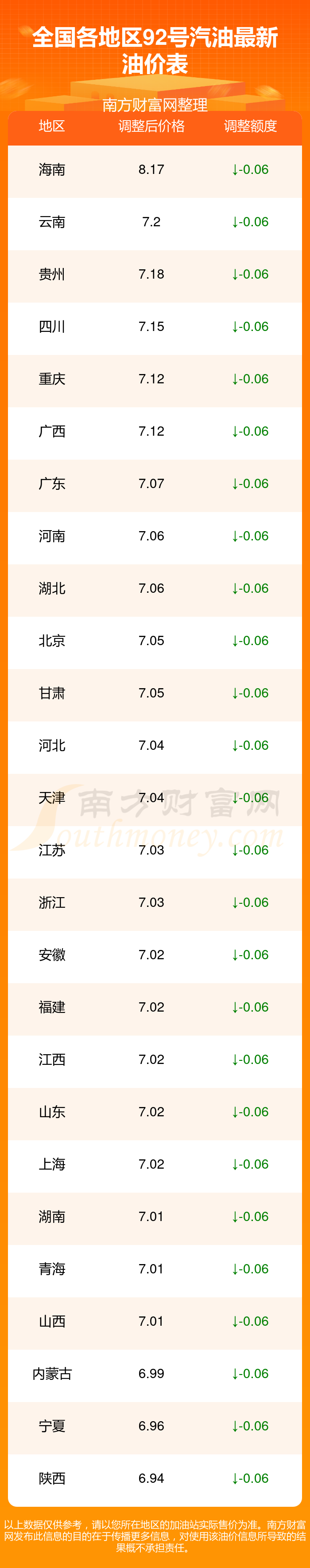 全國(guó)92號(hào)汽油平均價(jià)格為:7元每升,其中,最低為陜西,價(jià)格6.94元/升,最高為海南,價(jià)格8.17元/升。