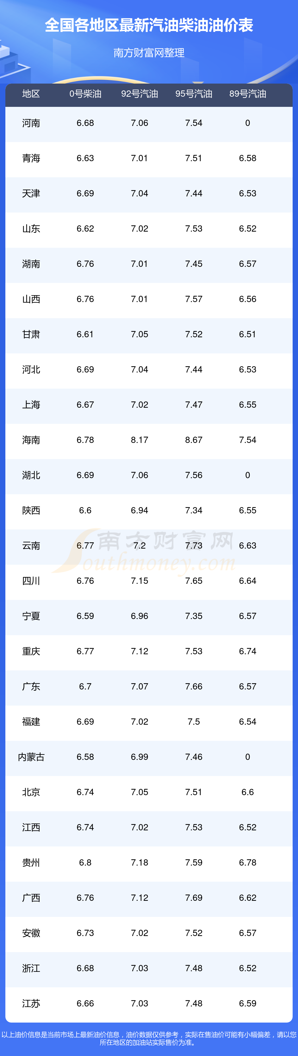 油價(jià)數(shù)據(jù)僅供參考,請(qǐng)以您所在地區(qū)的加油站報(bào)價(jià)為準(zhǔn)。南方財(cái)富網(wǎng)發(fā)布此信息的目的在于傳播更多信息,對(duì)使用該油價(jià)信息所導(dǎo)致的結(jié)果概不承擔(dān)任何責(zé)任。