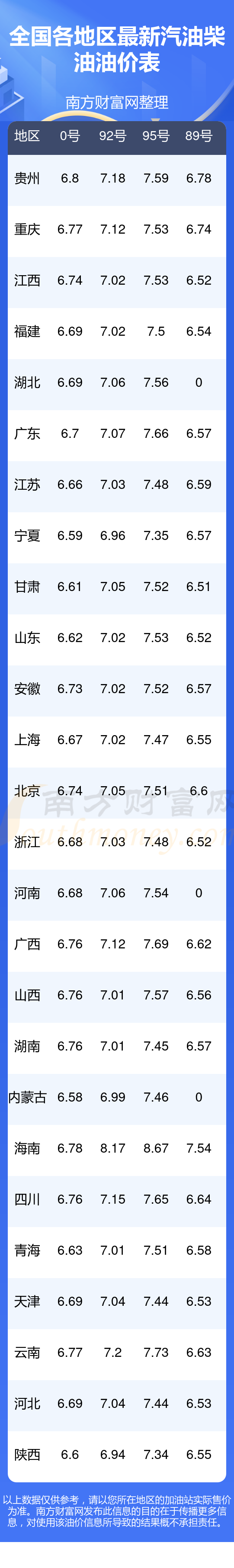 油價(jià)數(shù)據(jù)僅供參考,請(qǐng)以您所在地區(qū)的加油站報(bào)價(jià)為準(zhǔn)。南方財(cái)富網(wǎng)發(fā)布此信息的目的在于傳播更多信息,對(duì)使用該油價(jià)信息所導(dǎo)致的結(jié)果概不承擔(dān)任何責(zé)任。