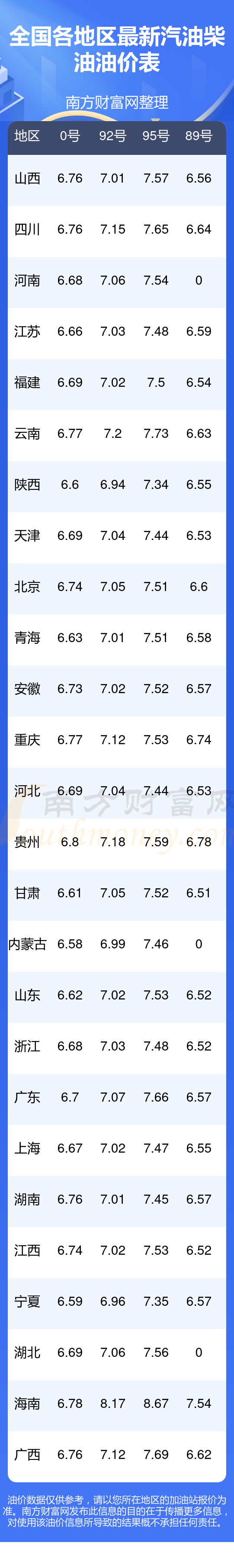 油價(jià)數(shù)據(jù)僅供參考,請(qǐng)以您所在地區(qū)的加油站報(bào)價(jià)為準(zhǔn)。南方財(cái)富網(wǎng)發(fā)布此信息的目的在于傳播更多信息,對(duì)使用該油價(jià)信息所導(dǎo)致的結(jié)果概不承擔(dān)任何責(zé)任。