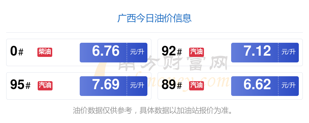 油價數(shù)據(jù)僅供參考,請以您所在地區(qū)的各加油站報價為準(zhǔn)。