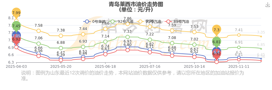 11月30日青島萊西市汽油、柴油價格是11月25日調(diào)整后的價格,每升價格具體為:92號汽油為6.85元,下降了0.06元,下降幅達0.87%;95號汽油為7.35元,下降了0.06元,下降幅達0.81%;89號汽油為6.36元,下降了0.05元,下降幅達0.78%;0號柴油為6.45元,下降了0.05元,下降幅達0.77%。