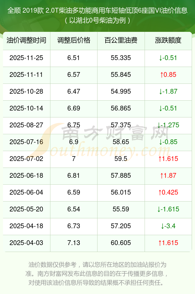 根據(jù)11月25日0號柴油最新調(diào)整價格6.51元/升來計算(以湖北為例),該車型每百公里的平均油費是55.335元,上一輪11月11日調(diào)整價格6.57元每升來計算,每百公里的平均油費是55.845元,對比上一輪少花0.51元,下一輪的油價調(diào)整時間是12月8日24時。