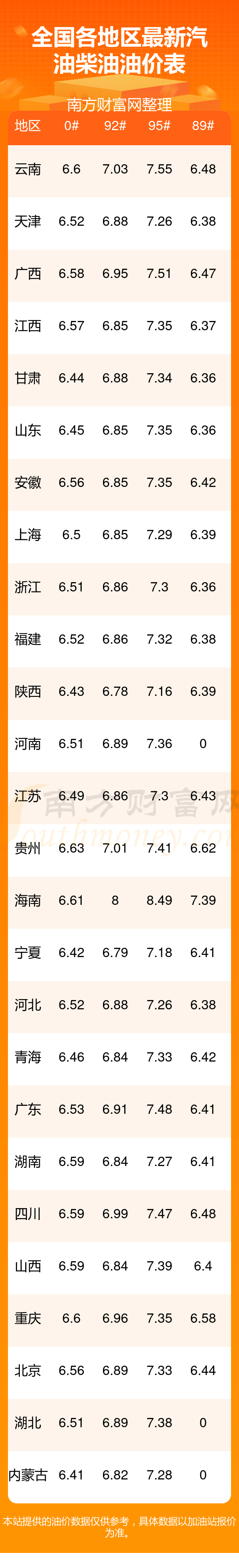 根據(jù)11月25日油價調(diào)整后的價格,全國89號汽油11月30日最新平均價格為每升6元,其中全國89號汽油最低為浙江,價格為6.36元/升,89號汽油最高為海南,價格為7.39元/升。,下一輪油價調(diào)整時間12月8日24時,距離現(xiàn)在還有8.4天。
